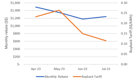 The above chart shows the savings realized by a client over the first 4 months since the commencement of operation. Note that the buyback tariff closely follows the trend of monthly USEP price in Figure 1. In just over 4 months, the 440 kWp system has generated a total of SGD 5258 in savings.